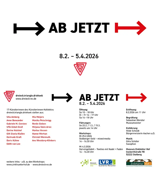 Die neue Ausstellung AB JETZT des Künstlerinnen-Kollektivs dreieck.triangle.driehoek im Museum Zinkhütter Hof (08.02 – 05.04.2026) taucht tief ein in Stolbergs industrielle Spuren – und lenkt den Blick in die Zukunft – lokal, individuell, gesellschaftskritisch. Die Arbeiten von 17 Künstlerinnen aus der EUREGIO B-D-NL eröffnen aktuelle Blickwinkel auf eine Region im Wandel. Ulla Amberg . Anne Benezeder . Gabriele M. Corsten . UTA Göbel-Groß . Dorine Hulshof . GiK Gisela Klaßen . Gertrude Kraft . Doris Kühne . Edith van Loo . Mia Meijers . Monika Petschnigg . Renée Sieben . Mirjana Stein-Arsic . Marlou Vossen . Hanne Werhan . Christel Wermuth . Ans Westdorp Klinkers
