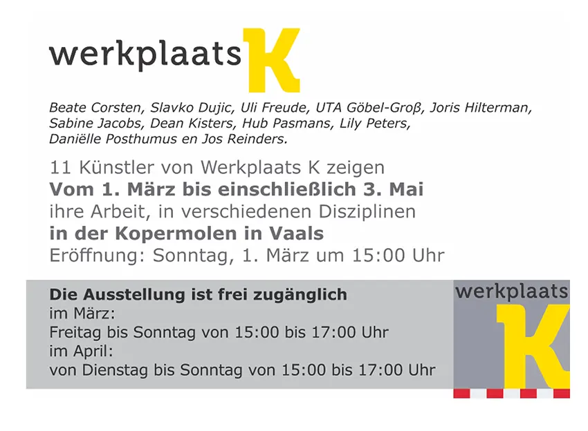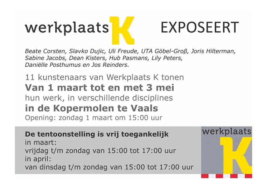 Werkplaats K Ausstellung 1.3. – 3.5.2026 Kopermolen Vaals Tumke2026-04-02T06:39:53+00:00 Teilen Sie diese Geschichte, wählen Sie Ihre Plattform! FacebookXLinkedInWhatsAppPinterestEmail